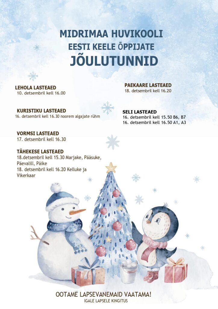 Midrimaa Huvikooli Jõulupidu! Jõulupidu toimub juba 7. detsembril Lindakivi Kultuurikeskuses. Esinevad nii tantsijad, lauljad kui ka eesti keele õppijad. Tulge